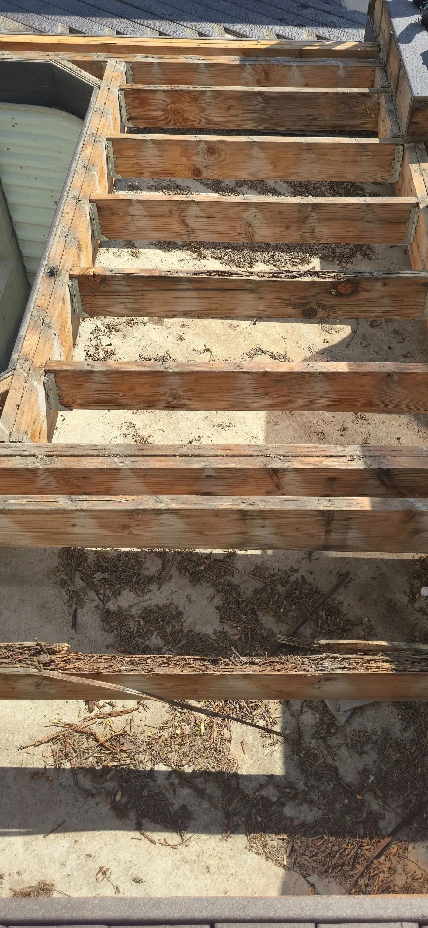 Rotted Boards or Joists: Water damage, especially in shaded or high-moisture areas, can lead to decay.