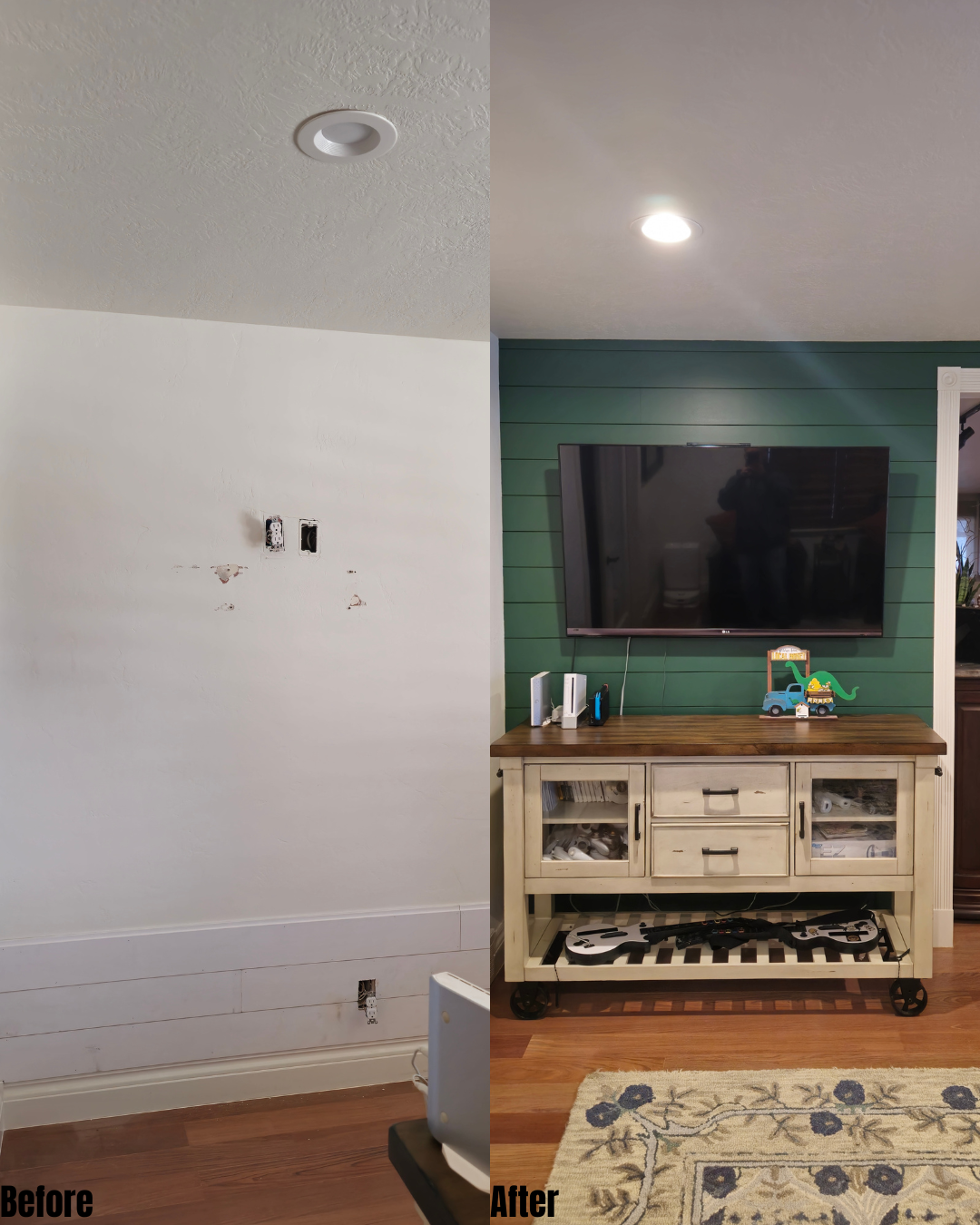 After: We installed shiplap painted in a deep green, adding texture and sophistication. The TV now blends seamlessly into a thoughtfully designed space.