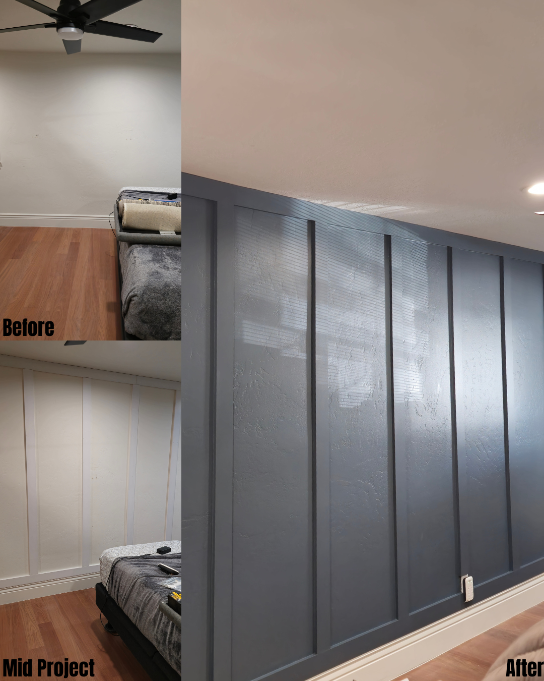 After: We added vertical paneling painted in a rich grey-blue, giving the room a luxurious, hotel-inspired atmosphere.